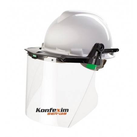 MSA-KASOT-E WBT Zestaw dla elektryka - składa się z hełm, ramki i osłony, idealny do zastosowań z ograniczonym ryzykiem wystąpienia łuku elektrycznego. Hełm z czteropunktową więźbą , regulowaną systemem Push-Key, z potnikiem pcv. Osłona twarzy wykonana z poliwęglanu , wymiar 203 x 432 x 1,5 mm, klasa optyczna 1, filtr 2C-1,2 , wytrzymałości mechanicznej B. Osłona zapewnia ochronę przed kroplami i rozbryzgami cieczy (3), łukiem elektrycznym (8) oraz odpryskami stopionych metali i gorącymi ciałami stałymi (9)