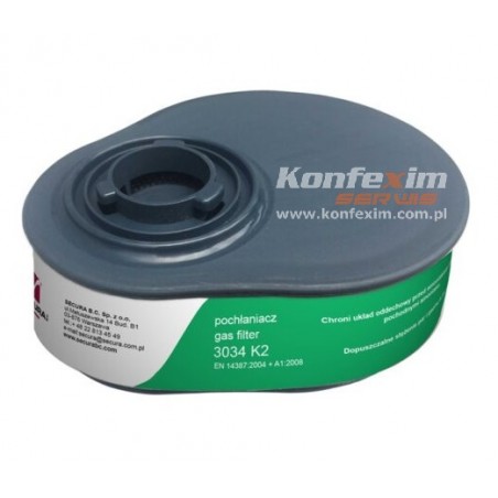 Pochłaniacz K2 3034 SECURA 3000, po skompletowaniu z półmaską lub maską, chroni układ oddechowy przed amoniakiem i jego pochodnymi organicznymi, przy łącznym objętościowym stężeniu nie przekraczającym wartości 0,5%. Substancje, przed którymi chroni pochłaniacz 3034 K2: amoniak i jego pochodne organiczne, itp.