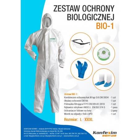 Zestaw ochrony biologicznej BIO-1 , to komplet sprzętu ochronnego zabezpieczającego w stopniu podstawowym osoby narażone na kontakt z zakaźnym materiałem biologicznym , przenoszącym się drogą kropelkową, np. typu grypa, koronawirus . W zestawie BIO-1 wszystkie artykuły produkowane są wg norm europejskich.