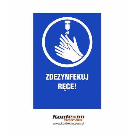 Dezynfekuj ręce - niebieski , samoprzylepny znak informacyjny BHP. Najczęściej umieszczany przy płynach , dozownikach ze środkami do dezynfekcji rąk, np. przy wejściach do firmy , do pomieszczeń , przy klasach, salach itp.
