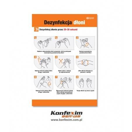 Instrukcja dezynfekcji rąk: tablica informacyjna BHP z instrukcją graficzną skutecznego mycia dłoni przy użyciu płynu dezynfekującego - zgodnie z zaleceniami Światowej Organizacji Zdrowia (WHO).