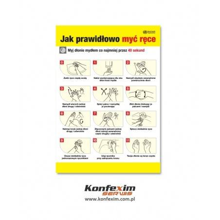 Instrukcja mycia rąk:  tablica informacyjna BHP z graficzną instrukcją należytego mycia dłoni - zgodnie z zaleceniami Światowej Organizacji Zdrowia (WHO).