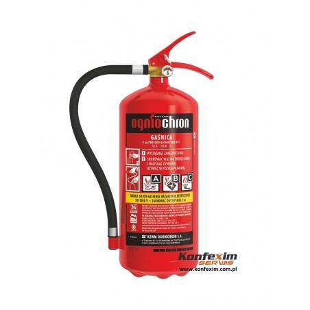 *Gaśnica GP-6x ABC/E pozwala na gaszenie urządzeń elektroenergetycznych o napięciu do 245000 V (fakt ten potwierdza dodatkowa etykieta klejona obok etykiety głównej).