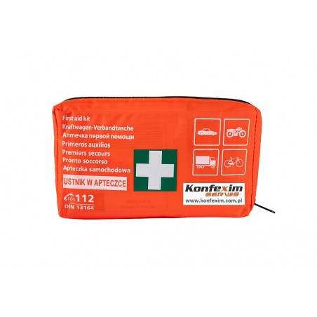 Samochodowa apteczka pierwszej pomocy przeznaczona jest do wyposażenia samochodów, motocykli oraz innych pojazdów mechanicznych. Wykonana jest w formie saszetki z wodoodpornego materiału, zamykana na zamek błyskawiczny. Dodatkowo apteczka ma naszyty rzep mocujący ją do tapicerki. Wymiary apteczki : 215 mm x 125 mm x 60 mm