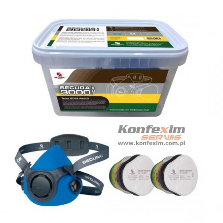Zestaw SECURA 3000 ADR składa się z dwufiltrowej półmaski SECURA 3000 skompletowanej z dwoma pochłaniaczami typu ABEK1 3025 oraz dwoma filtrami SECAIR 3000.02 P2 R. Zestaw zapakowany jest w szczelne, przezroczyste opakowanie plastikowe z wieczkiem. Data ważności umieszczona jest na opakowaniu zestawu.